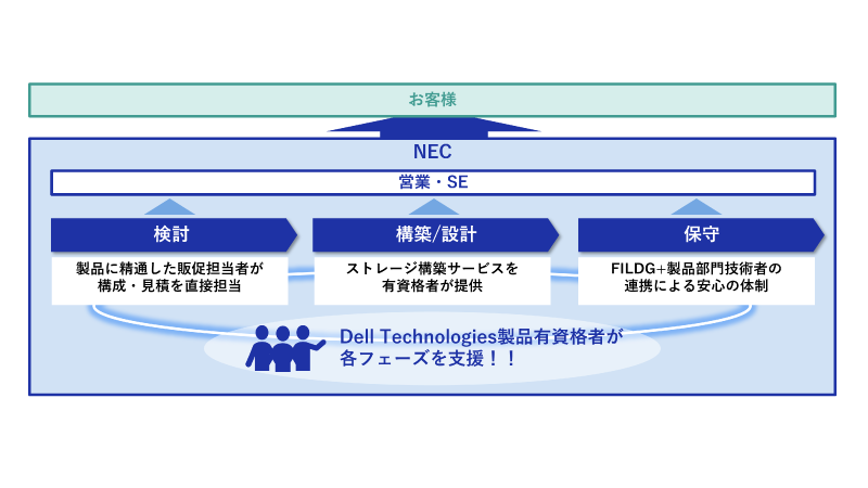 NECはDell EMCストレージ製品に関しても、有資格者による一貫した体制でサービスを提供いたします。提案・構築・保守ともにDell社認定資格を有した専門家がサポートしますので、安心してお任せいただけます。