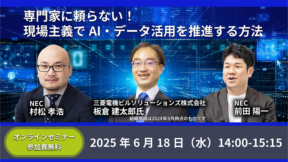 そこで本セミナーでは、実際に成果をあげているAI・データ活用ユースケースをNECのコンサルタントが紹介するとともに、成功企業の共通点について解説します。また、AI・データ活用の全社展開を実現した三菱電機ビルソリューションズさまにご登壇いただき、推進担当者が重視すべきポイントやデータ活用人材の育成法などをご紹介します。