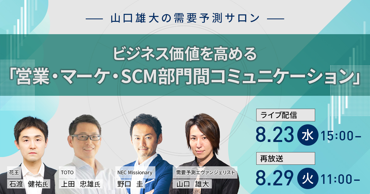 第5回のテーマは「営業・マーケティング・SCM部門間のコミュニケーション」です。SCMやS&OPを推進する上で、KPIの異なる部門間でのコミュニケーションは避けることができない重要なテーマですが、多くの方が課題と感じているのも事実です。今回は、花王株式会社の石渡健祐氏、TOTO株式会社の上田忠雄氏をゲストにお迎えし、各業界の視座からコミュニケーションについて語っていただきます。当日は、これまで1万人以上の実務家との対話を通し共創をリードし続けるNEC DX Missionaryの野口圭も参加し、コミュニケーション理論についてのディスカッションを通じて、円滑なコミュニケーションのポイントを共に考えます。是非ご期待ください。