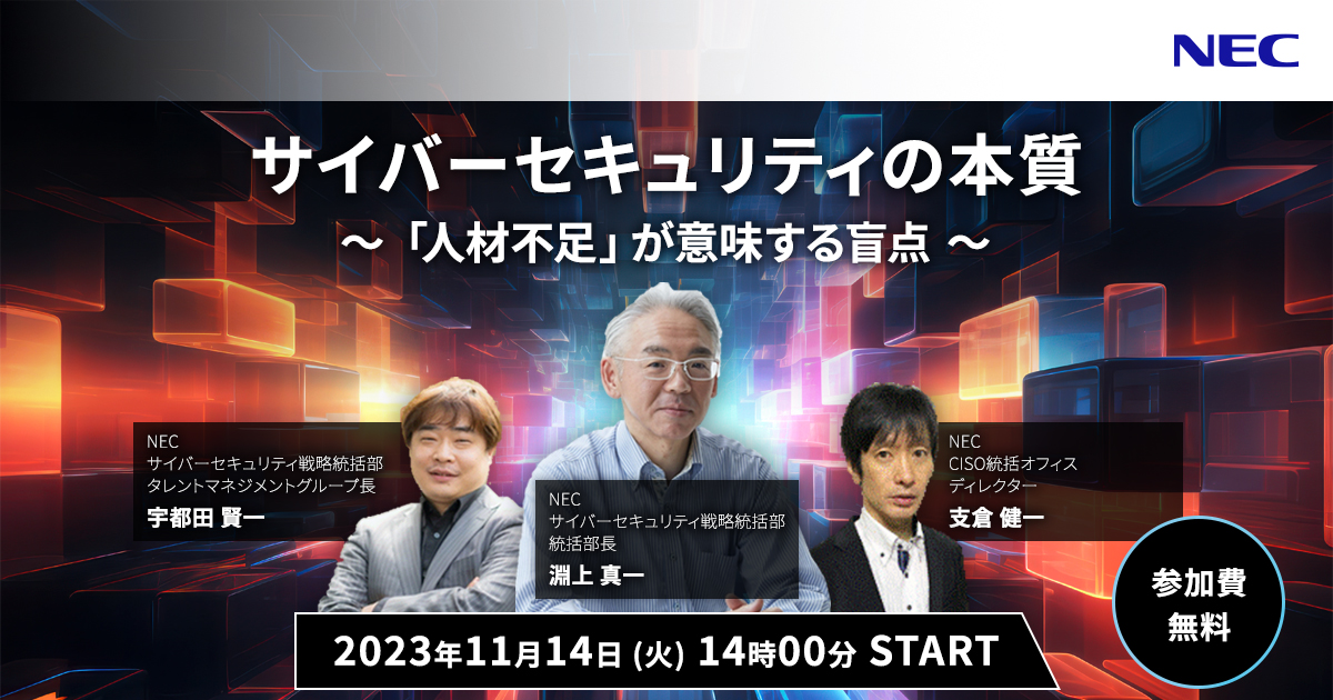【対談】セキュリティ課題の本質を解決するための人材戦略  ̄ ̄ ̄ ̄ ̄ ̄ ̄ ̄ ̄ ̄ ̄ ̄ ̄ ̄ ̄ ̄ ̄ ̄ ̄ ̄ ̄ ̄ ̄ ̄ ̄ ̄ ̄ ̄ NECグループのセキュリティ人材を考えている現場責任者が登壇いたします。 NECが実践するセキュリティ人材の育成体系や方法論だけでなく、お客様企業へおすすめするセキュリティ対策の状態や育成対象、 人材育成像など、現場メンバーがリアルな声を対談形式で深堀していきます。 セキュリティ業務に携わっている皆様に、有用なヒントがたくさん見つかるはずです。ご期待ください。 NEC コーポレート IT・デジタル部門 CISO統括オフィス ディレクター 支倉 健一 NEC サイバーセキュリティ戦略統括部 タレントマネジメントグループ長 宇都田 賢一, CISSP NEC サイバーセキュリティ戦略統括部 統括部長 淵上 真一, CISSP <モデレータ> |