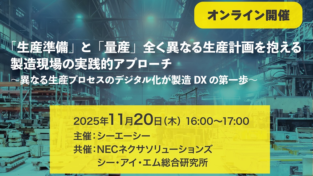 本セミナーでは、量産型生産管理システムおよび金型の生産管理システムの有識者を交えて、パネルディスカッション形式で量産型製造業での生産計画の課題とその具体的な対応例について意見交換します。(主催 株式会社シーエーシー)