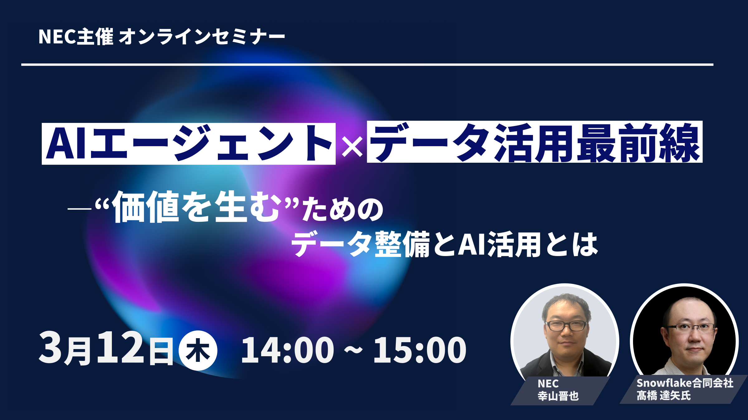 本セミナーでは、Snowflake社に登壇いただき、次世代のデータ活用を支える基盤として注目されるSnowflakeが持つAIエージェント「Snowflake Intelligence」の最新機能やお客様事例をご紹介します。NECからは、データをビジネス課題の解決に活用するための方法や事例をご紹介します。