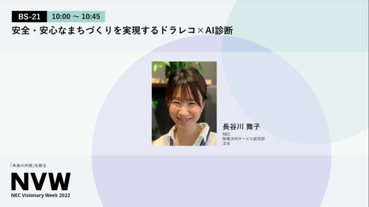 ※2022年10月5日 に実施したNEC Visionary Week2022「BS-21 安全・安心なまちづくりを実現するドラレコ×AI診断」のアーカイブ配信です。NEC Visionary Week2022及び、質疑応答、視聴アンケートは既に終了しています。