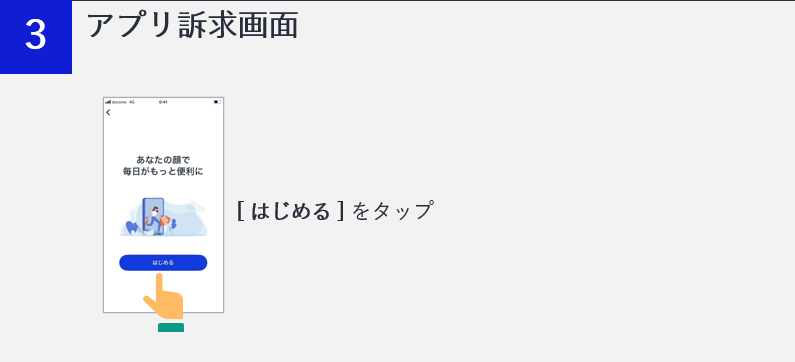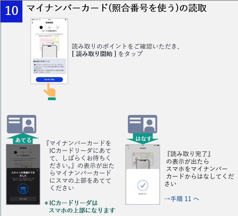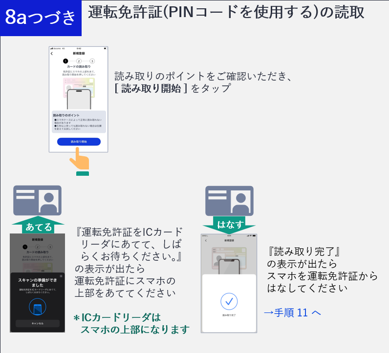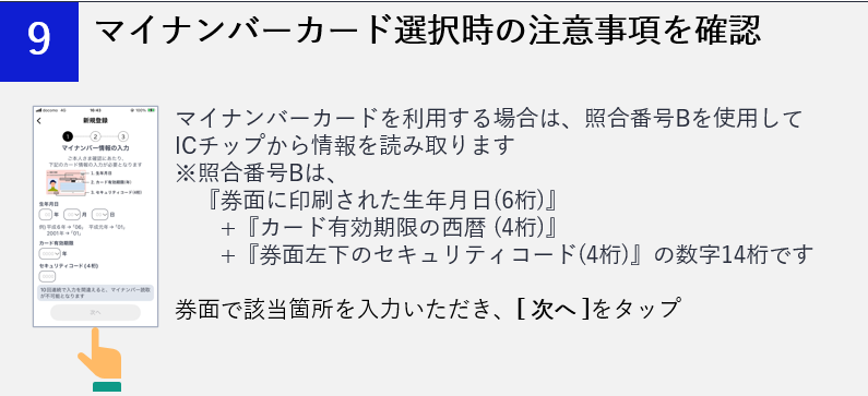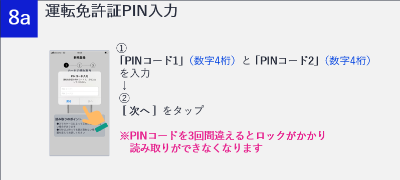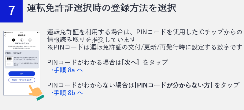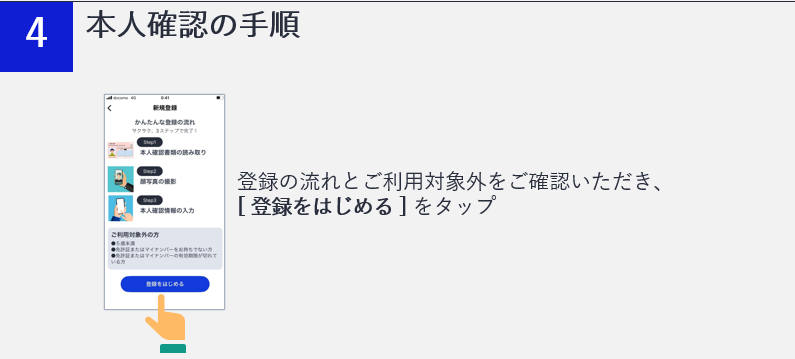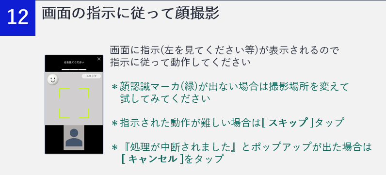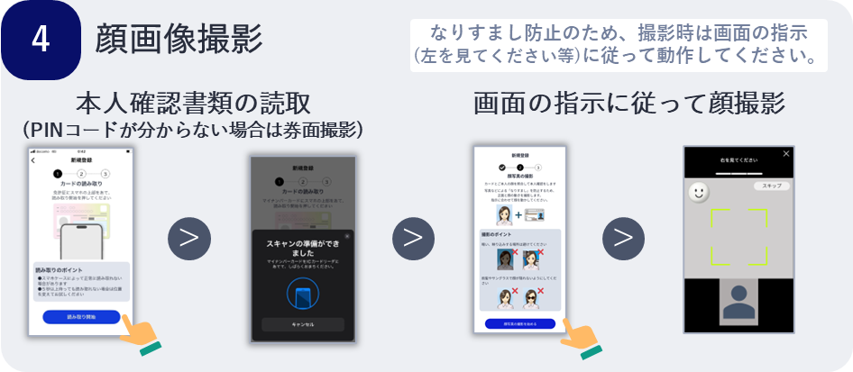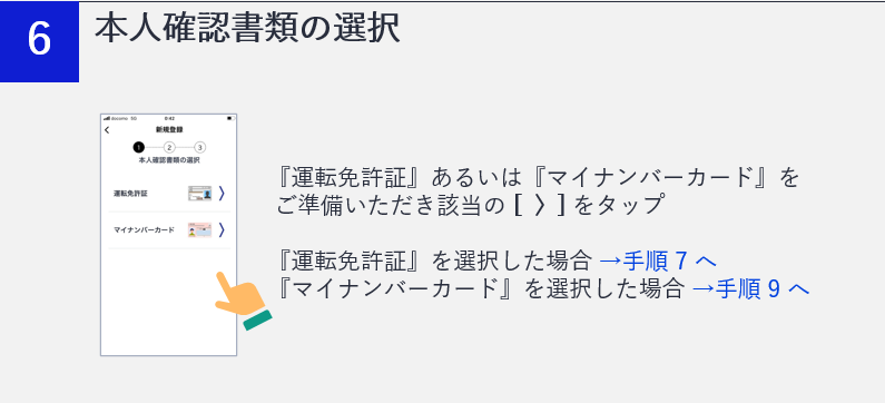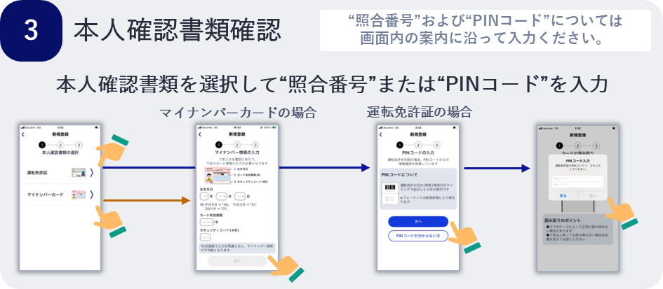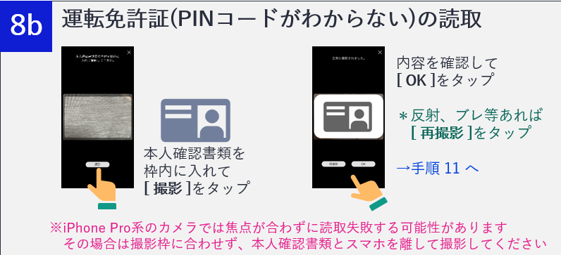 A2 撮影して登録:iPhoneのProまたはPro Maxをお使いの場合、カメラピントが少し合わせづらいことがあります。本人確認書類撮影の際には、枠に合わせるのではなく端末と本人確認書類を20cmほど離してくっきり映るように撮影していただけますよう、お願いいたします。ICチップ読み取りで登録:うまく読み取れない場合、スマホカバーを一度外して再度お試し願います。