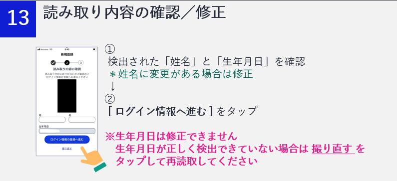 A3 氏名については、読み取り結果をご自身で修正していただくことができます。生年月日については、読み取り結果の修正ができません。お手数ですが再度本人確認書類の撮影をお願いいたします。その際、以下の事項にご注意の上実施をお願いいたします。