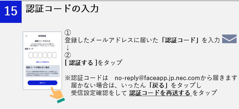 A6 認証コードが届いていない場合は、迷惑メールフォルダに振り分けられていないかご確認ください。もし迷惑メールフォルダにも届いていないようでしたら、認証コードの[再送信]ボタンを押下し、お試しください。