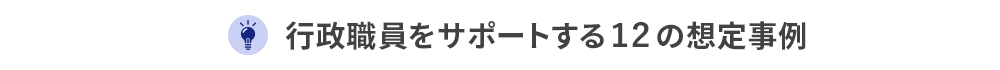 議会答弁支援、文書校正AI、総合窓口アシスタント、例規検索支援など12の具体的な行政業務において、生成AIの想定事例を掲載。豊富な行政機関向けシステム開発経験・ノウハウを元に、行政職員をサポートする想定事例をご紹介します。