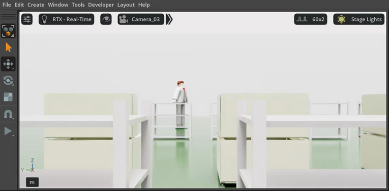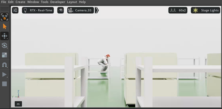 デジタルヒューマノイドの簡易的なモデルを制作し、人間の歩行、及び、しゃがむモーションの完成度を、仮想空間内で検証します。検証環境としては、複数台の生産設備と棚が設置された生産現場を採用しています。画像のデジタルヒューマノイドはBlenderを使用し、周囲環境はOmniverseのUSD ComposerとIsaac Simを使用して、日本電気株式会社が完全自作しています。 © NEC Corporation 2025