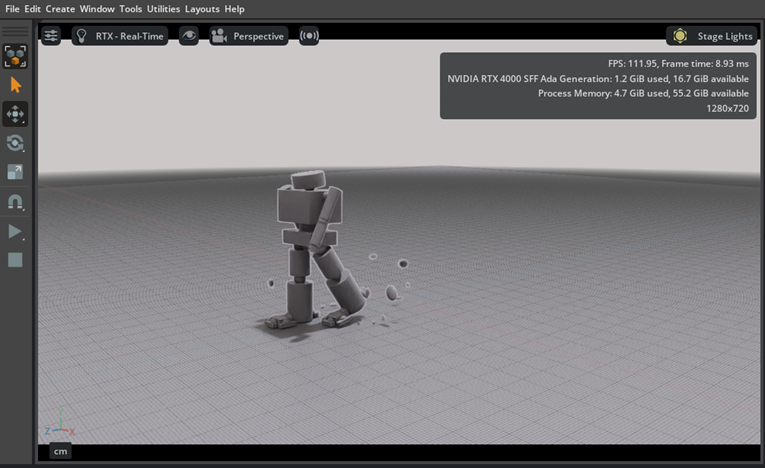 簡易二足歩行ロボットの砂利道歩行を検証し、微小重力環境下(宇宙モデル)の仮想空間内で、20個の砂利の舞い上がる様子を観察・分析します。簡易二足歩行ロボットと、周囲環境はOmniverseのUSD ComposerとIsaac Simを使用して、日本電気株式会社が完全自作しています。 © NEC Corporation 2025