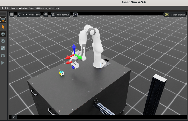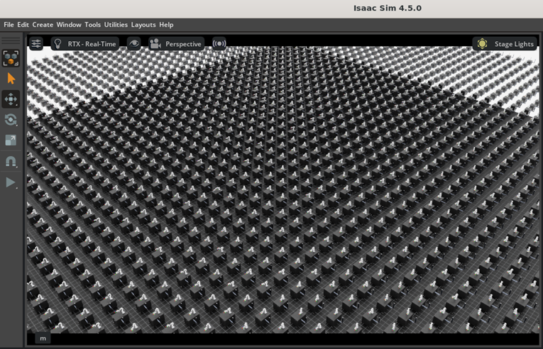 アームロボットの強化学習(Omniverse/Isaac Sim環境)により、サイコロの把持から目標位置(座標点)への運搬動作の実現可能性を検証。仮想空間の試験現場では最大4096台(64×64配置)のアームロボットが固定台に据えられた状態で動作を実施します。アームロボットは、NVIDIA OmniverseのIsaac Lab強化学習アセットを使用します。
