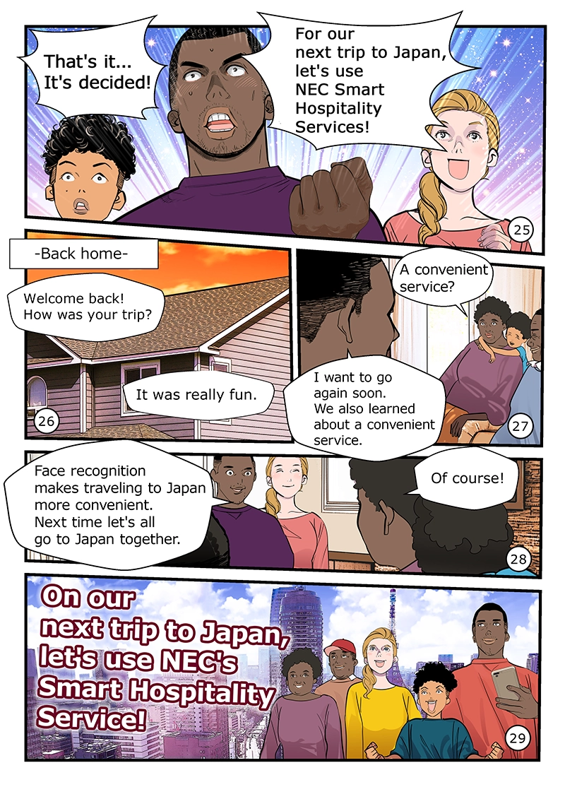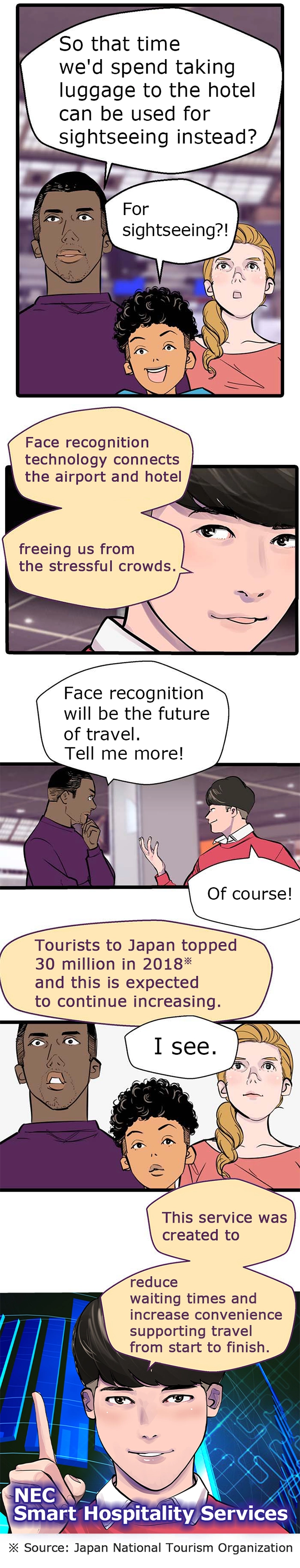 World-class NEC face recognition technology shortens time-consuming procedures such as luggage pickup and hotel check-in.