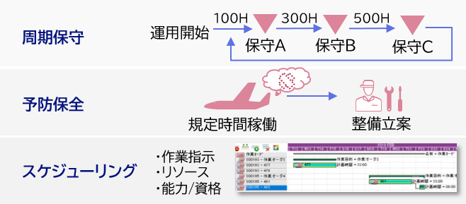 周期保守や予防保全などの保守計画の立案、作業者の資格も考慮したスケジューリングが可能です。