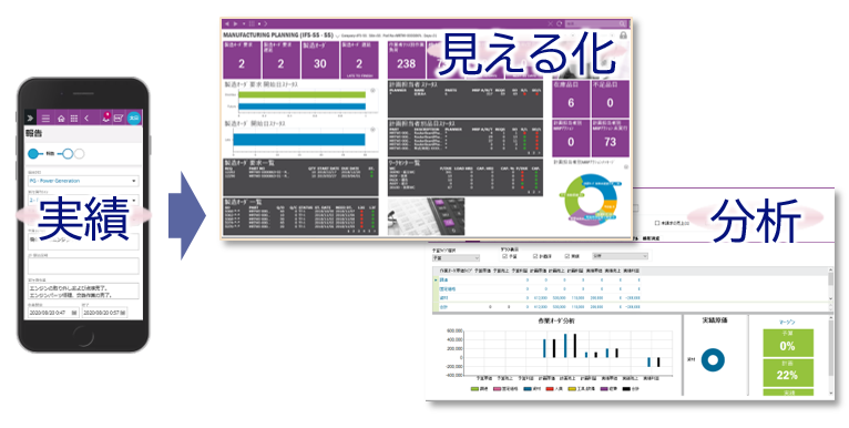 モバイル端末で作業チェックリストを確認しながら作業を実施。作業完了時にはモバイル端末で実績報告を簡単操作で行えます。各現場からの報告結果は集約されて見える化・分析できるので、問題の早期把握、対処ができるようになります。