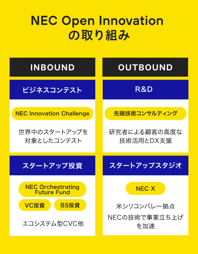 具体的には、ビジネスコンテスト「NEC Innovation Challenge」開催のほか、「NEC Orchestrating Future Fund」というエコシステム型CVCやVC投資、BS投資などスタートアップ投資もしています。