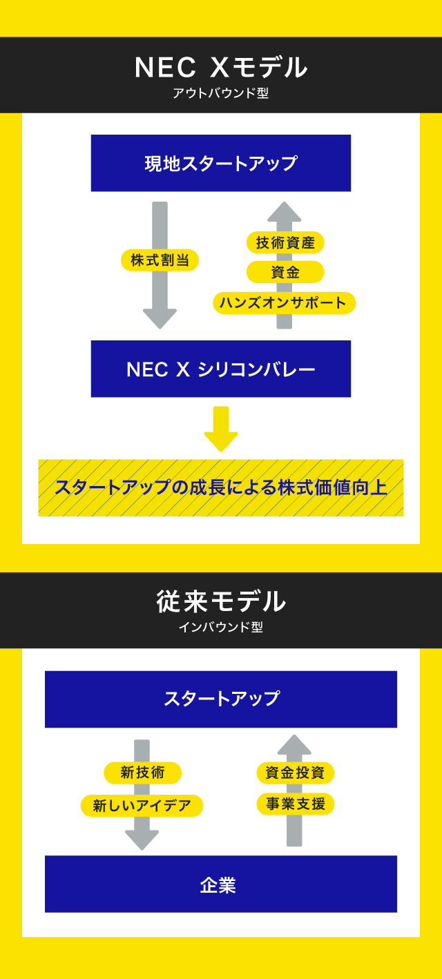一方でNEC Xは、自分たちの技術を他社に活用してもらうことで、スタートアップ企業の成長を支援し、共にビジネスを創出しようという「アウトバウンド」的な発想から生まれたモデルです。