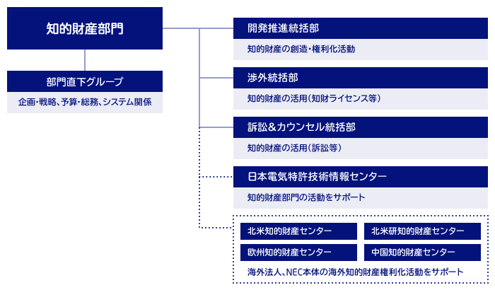 知的財産の創造支援・権利化を行う「知的財産ポートフォリオ構築統括部」、知的財産の活用を知財ライセンス等から支援する「渉外統括部」の2部門が一体となって、知財戦略の策定、知的財産ポートフォリオの構築、ノウハウの管理、価値創出や活用促進に取り組んでいます。また、NECのブランド、商品デザインなどの知的財産を組み合わせた活用を推進しています。