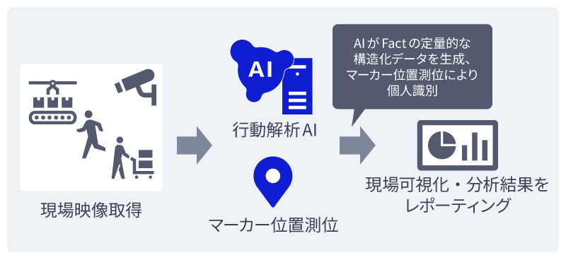 現場映像を取得、行動解析AIとマーカー位置測位技術により、特定エリア内の全体および個人毎の作業状況・動線などのデータ化を実施