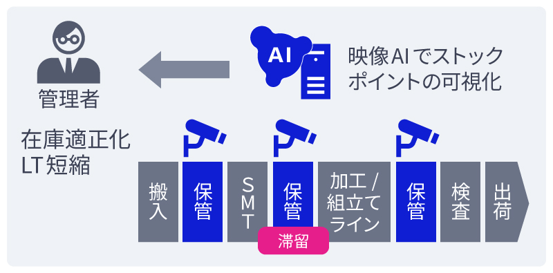 ストックポイントで現場映像を取得、解析AIを活用し在庫を可視化。在庫の適正化・LT短縮を行う。