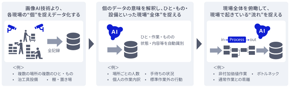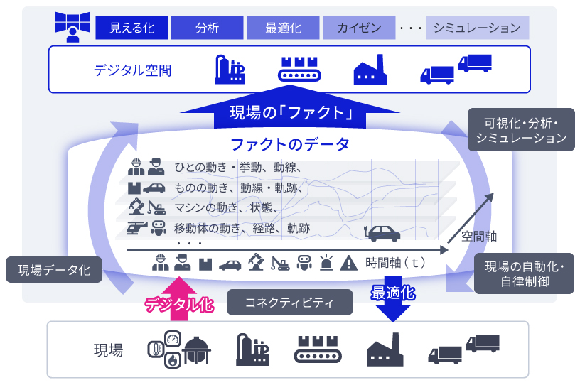 先進的な映像AI技術により、現場で起きている「ひとの動き」「ものの流れ」「状況の変化」など、従来のIoTデータだけでは捉えきれなかったリアルな現場の様子を、デジタル空間上に高精度で再現することが可能になります。