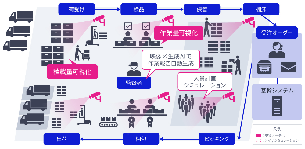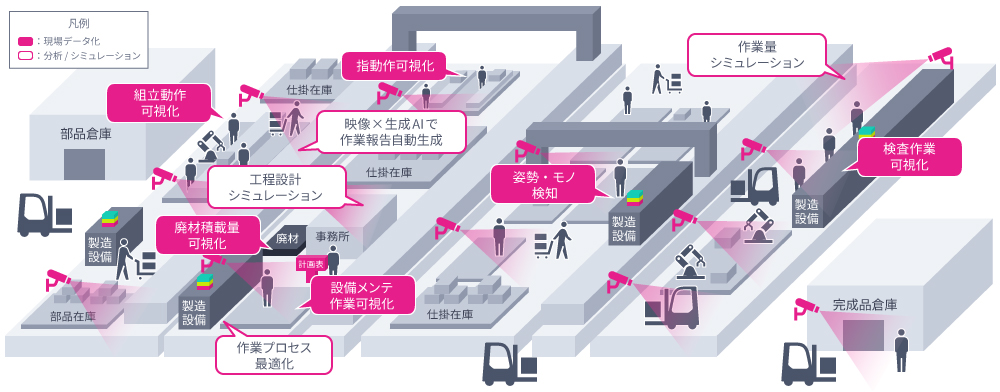 現場映像をAIが見える化。人の経験に頼らない最適なリソースプランを短時間で生成し、タイムリーな現場改善で生産性向上を支援します。