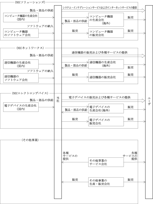 当社および連結子会社を中心とする関係会社で構成される当社企業グループが営んでいる主な事業内容、各関係会社の当該事業に係る位置付けおよび事業の種類別セグメントとの関連は、次のとおりである。なお、NECソリューションズ、NECネットワークスおよびNECエレクトロンデバイスの3部門は、「第5 経理の状況 連結財務諸表に対する注記 2.事業の内容」に掲げるセグメント情報の区分と同一である。