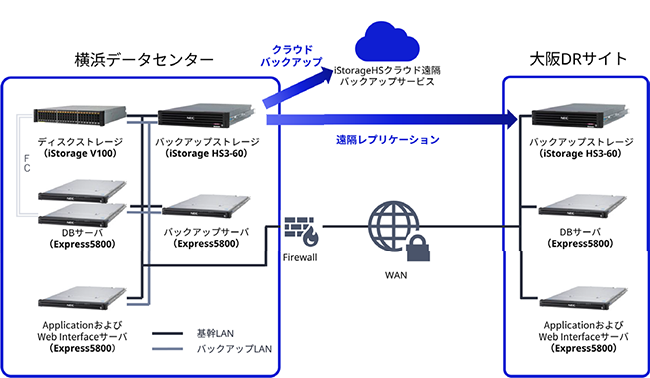 - DBサーバ(Express5800)の共有ストレージにオールSSDの「iStorage V100」を採用。横浜のデータセンターと大阪のDRサイトにバックアップストレージ「iStorage HS3-60」を導入し、DBサーバを含む基幹系主要サーバのバックアップデータをWAN経由で遠隔レプリケーション(リアルタイムバックアップ)