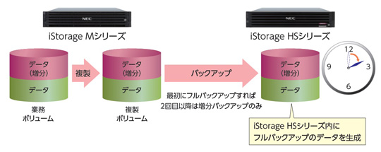 ユニファイドストレージ“iStorage Mシリーズ”と連携する場合、バックアップ専用のサーバ装置やソフトウェアが必要でしたが、“iStorage HSシリーズ”では連携機能を強化し、直接バックアップ/リストアが可能になりました。最初にフルバックアップするだけで2回目以降は増分だけで すみ、バックアップ時間を大幅に短縮。バックアップ/リストアの一連の流れを、コストをかけずに運用できます。