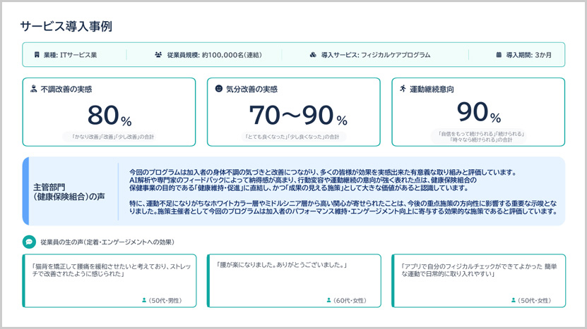 従業員の「腰痛・肩こり」は生産性低下の最大要因です。専門家とAIアプリによりパーソナライズされたケアを導入した企業では、高い割合で不調改善を実感し、高い運動継続意向も達成しています。確かな成果を生む実践事例をご紹介します。