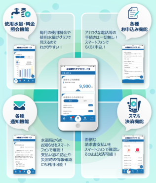 本サービスは、スマホを用いて使用水量及び水道料金のお知らせや、使用開始・中止、支払い方法変更等の手続きのオンライン化、電子決済によるキャッシュレス支払い、プッシュ通知によるきめ細やかな情報提供などを実現する、住民様向けのアプリケーションサービスです。