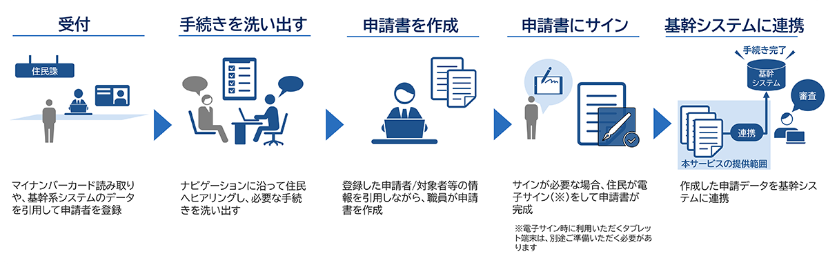 本サービスは、住民が行政手続きを行う際に、職員による聞き取りやマイナンバーカード読み取りにより申請書の手書き記入を不要とし、「書かないワンストップ窓口」を実現します。