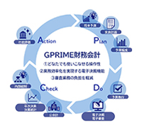 行政経営ソリューションは、財務会計・文書管理・人事給与・庶務事務の各業務システム、及び決裁基盤・GPRIME統合基盤から構成され、自治体職員の内部管理事務の包括的な情報化を実現するシステムです。