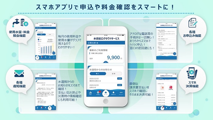 NEC水道窓口クラウドサービスは、スマホを用いて使用水量及び水道料金のお知らせや、使用開始・中止、支払い方法変更等の手続きのオンライン化、電子決済によるキャッシュレス支払い、プッシュ通知によるきめ細やかな情報提供などを実現する、住民様向けのアプリケーションサービスです。