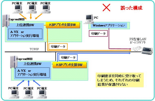 ネットワーク接続プリンタで印刷を行う場合、 PR-NP-06(LANボード)/PR-NP-07(LANアダプタ)は複数のサーバ/クライアントからの印刷ジョブを同時に受けてしまう可能性があり、正しい印刷結果が得られない恐れがあります。