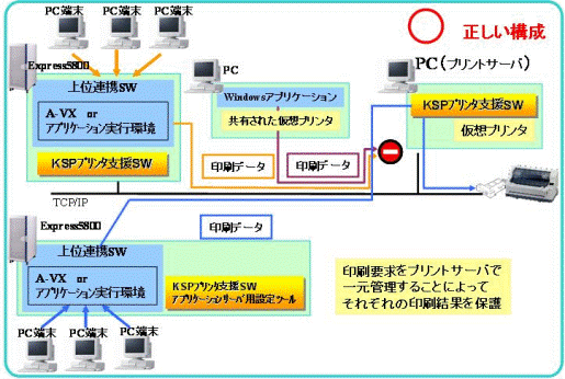 プリントサーバ印刷機能は、上位連携ソフトウェア(A-VX、アプリケーション実行環境)が動作するサーバ(アプリケーションサーバ)とは別にクライアントPC等のプリントサーバを設置し、プリントサーバでKSPプリンタ支援ソフトウェアの印刷制御を行うため、サーバ集中形態に比べ、サーバ上で動作するソフトウェアを少なくすることができ、サーバ負荷を軽減します。