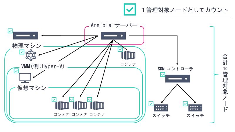 管理対象ノードは、物理マシン、仮想マシン、コンテナ、コントローラおよびその管理下にある全ての管理対象を数えます。