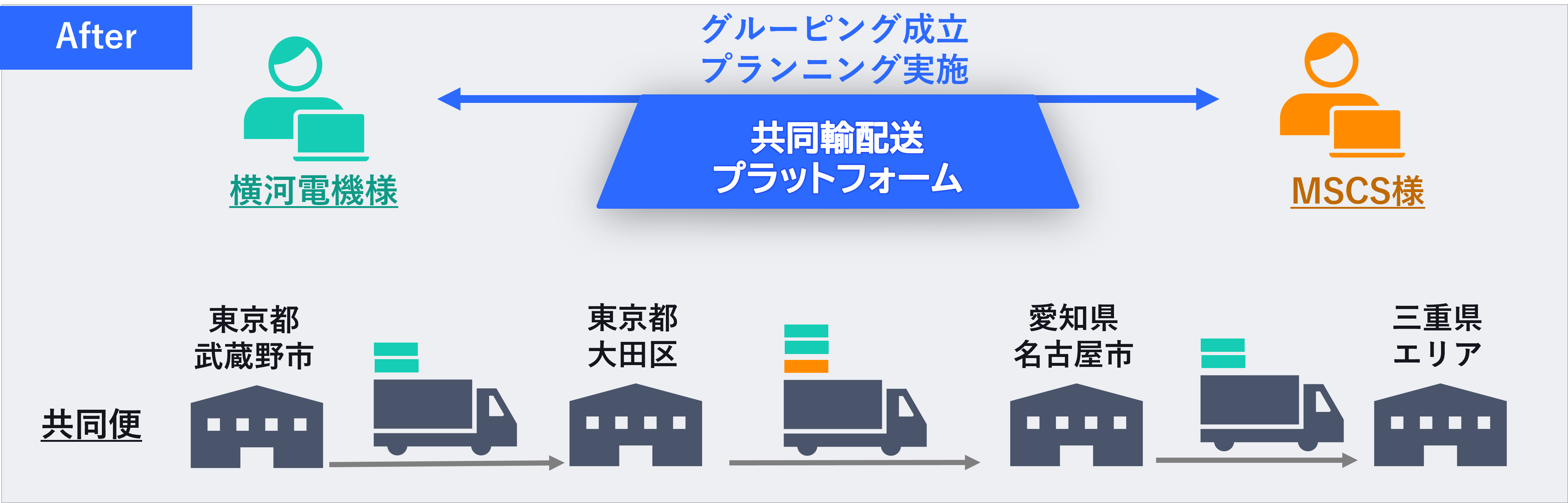 入力した情報をもとに今回、横河電機様の東京都武蔵野市-三重県エリアとMSCS様の東京都大田区-愛知県名古屋市ルートによる東京エリア(武蔵野市・大田区)-東海エリア(名古屋市・三重市)区間での共同輸配送が成立。