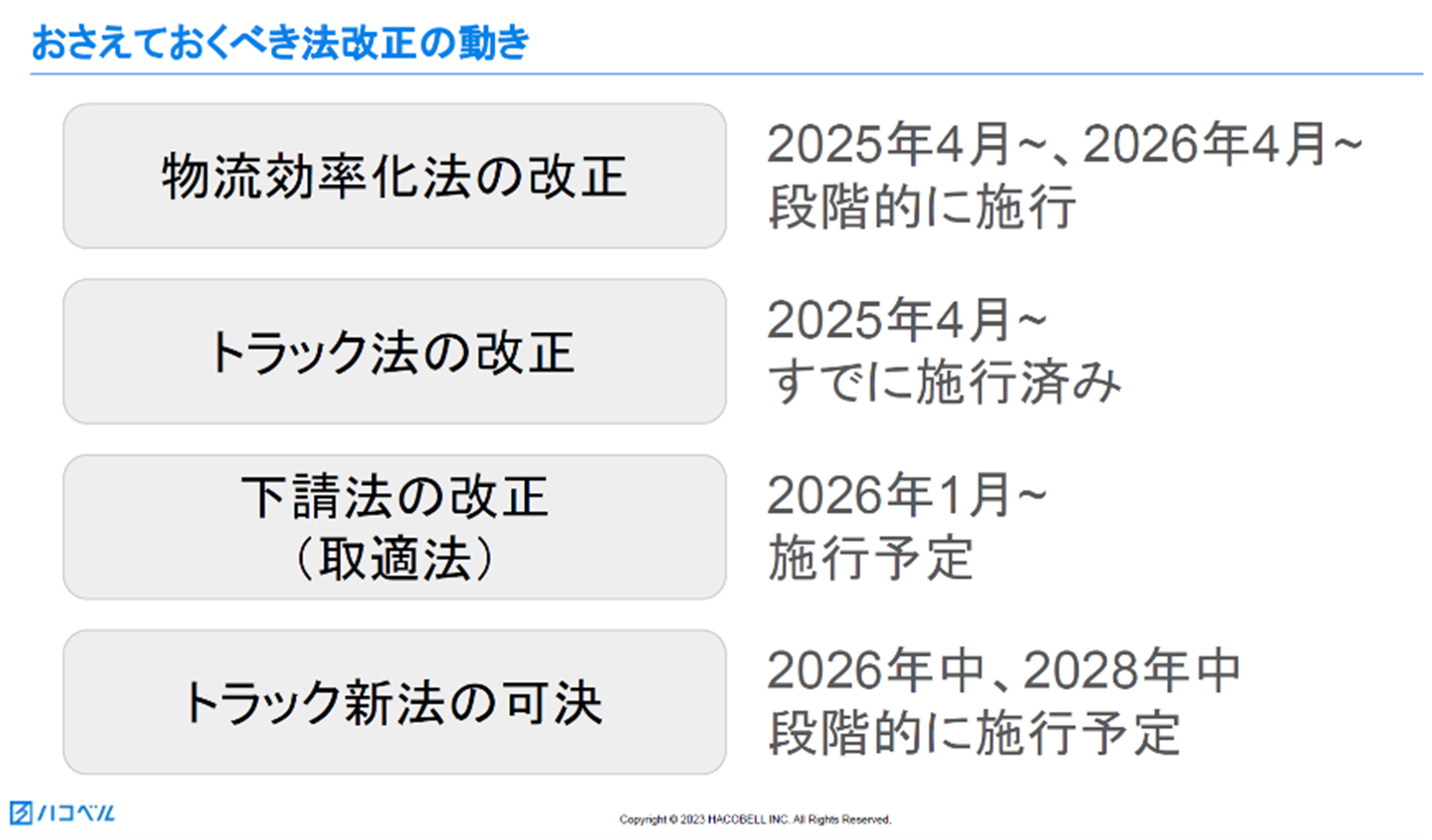 梅田さん(NEC 共同輸配送プラットフォーム事業責任者)から「ここまで立て続けに法律が改正されるというのは、どんな背景があるのか?」と質問があったので、菊田からはこんな解説をしました。