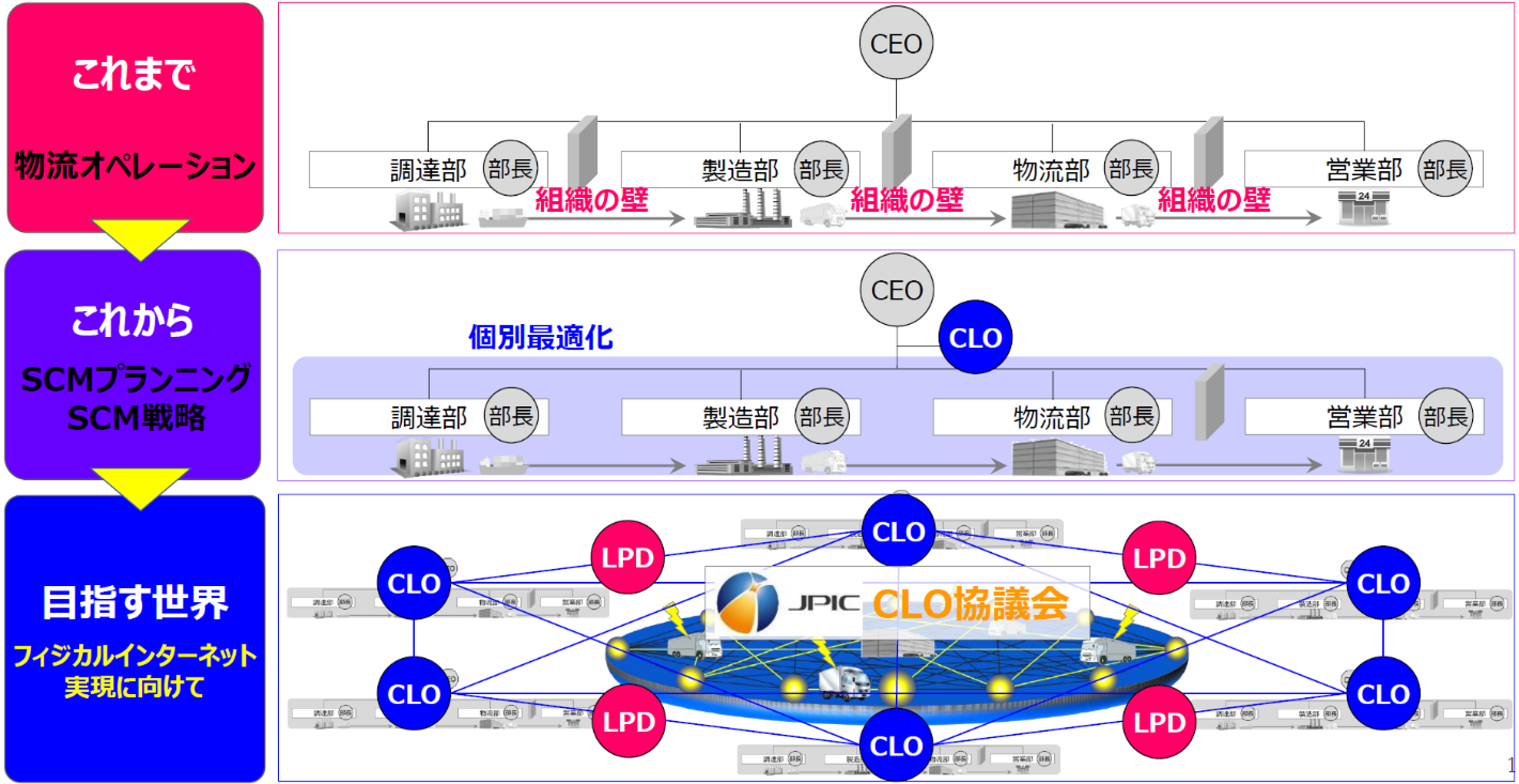 ところが、国家規格であるJIS Z 0111「物流用語」をみると、「ロジスティクス」の規定において、パーパス層に及ぶ「環境保全及び安全対策をはじめ社会課題への対応」の役割が明記されています。この重要項目が、物流統括管理者の役割規定には欠落しているのです。「ロジスティクスの重要任務を持たない最高ロジスティクス責任者」は、概念として成立しない。また右端は日本フィジカルインターネットセンター(JPIC)が提唱する「CLOの定義と役割」の内容で、地球社会にまでさらに視点を広げた規定がなされています。