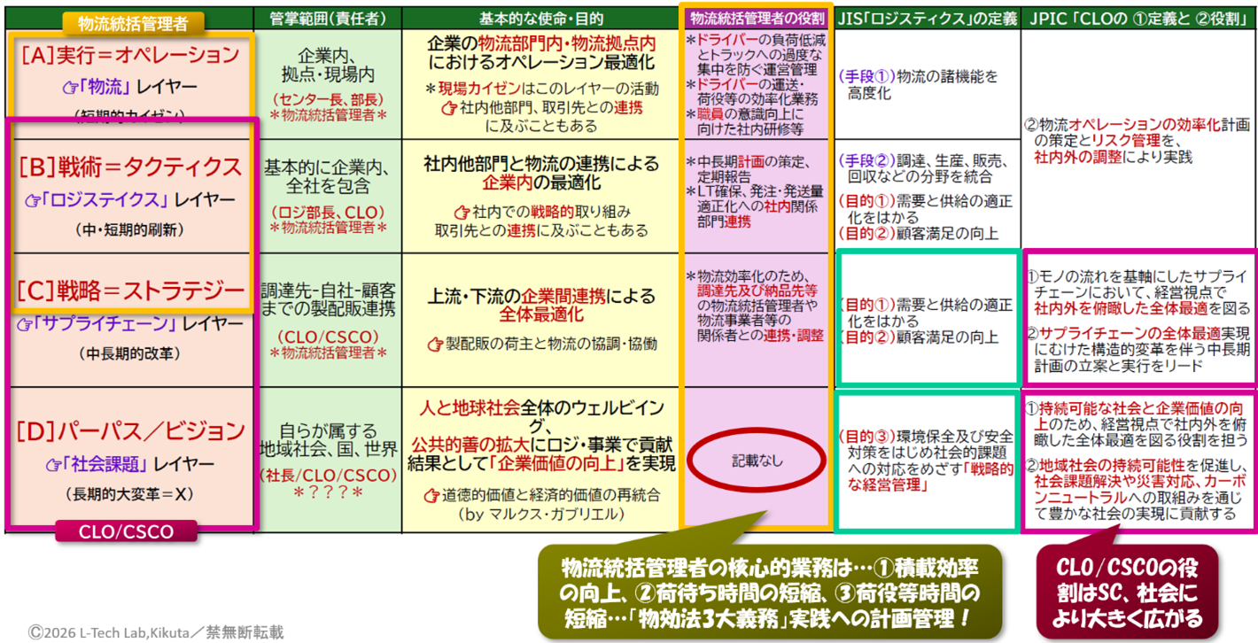 だから両者の役割は異なる。「物流統括管理者≠CLO」であり、「物流統括管理者<CLO」なのです。