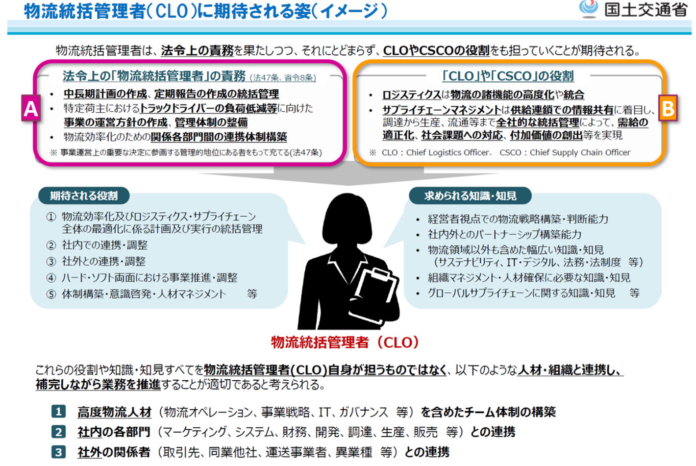 ご覧の通り、図の左囲みのAには物流統括管理者の役割を掲げる一方、右のBには、私が図表1で示した、「あるべきCLOの役割」の要点がきっちりと記載されています。そして上段の説明には「物流統括管理者は(Aの)法令上の責務を果たしつつ、それにとどまらず、(Bの)CLOやCSCOの役割をも担っていくことが期待される」とあるのがお分かりでしょう。