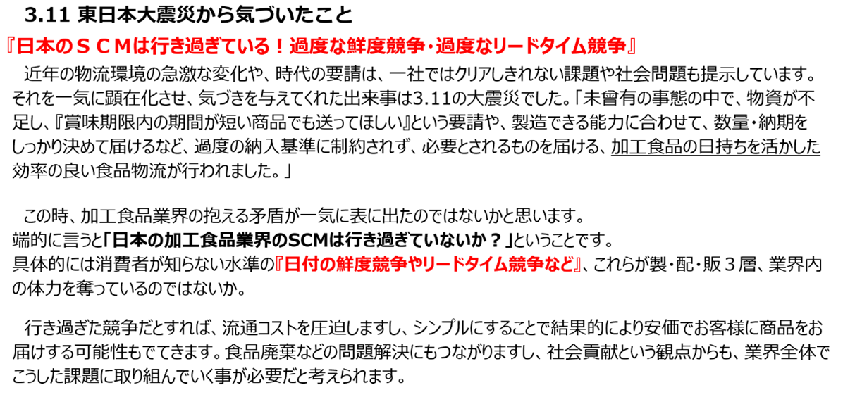 記載の通り、この経験を通してキユーピー社内で「消費者が知らない水準の『日付の鮮度競争やリードタイム競争など』が製・配・販3層、業界内の体力を奪っているのではないか」との問題意識が固まり、その是正に向けた物流改革の取り組み開始につながった……まさに、なるほど、の経緯ですね。