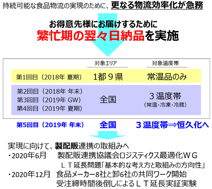 それでも図表4の通り、初めは慎重に繁忙期・常温品・1都9県の限定で試行を開始。その範囲を徐々に広げ、ついに全国・3温度帯での「LT2恒久化」にこぎつけたのは、3.11から8年を経た2019年のことでした。