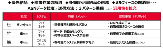 改正物効法では前述の①積載効率の向上、②荷待ち時間の短縮、③荷役等時間の短縮が3大義務として明記され、キユーピーのような特定荷主にはとりわけ、マスト要件になっています。この課題解決に有効な目玉対策の1つとして同社が注力しているのが、「ASN(事前出荷情報)を活用した検品レス化」の取り組みです(図表5)。