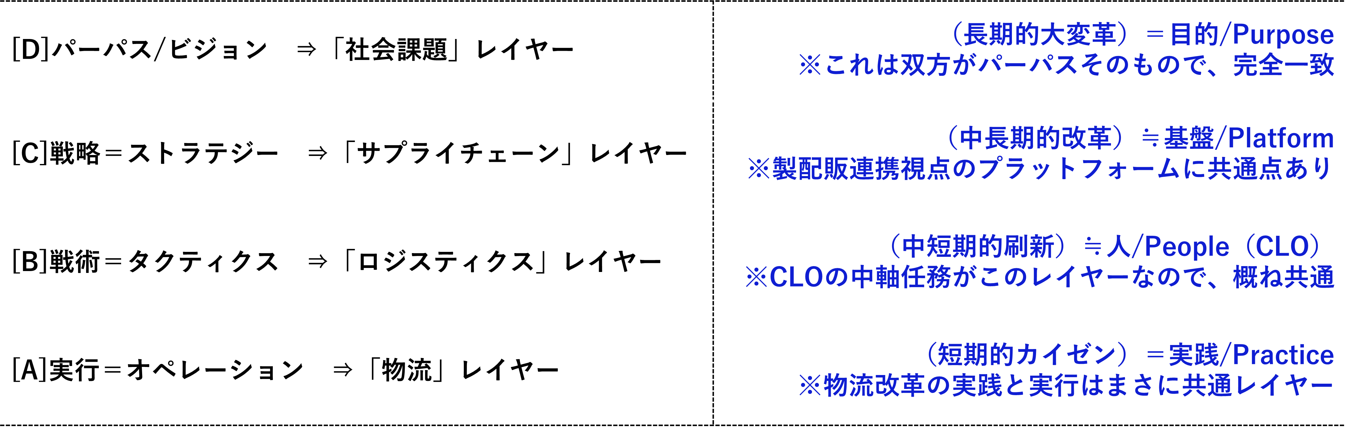 最後にぜひ指摘しておきたいのは、筆者がこの日の前田本部長とのパネルディスカッション冒頭で紹介した、筆者の独自資料「ビジネス遂行4階層でみる物流/ロジ/サプライチェーンと物流統括管理者・CLOの役割」で提示した「4階層」と、「4つのP」との共通点についてです。