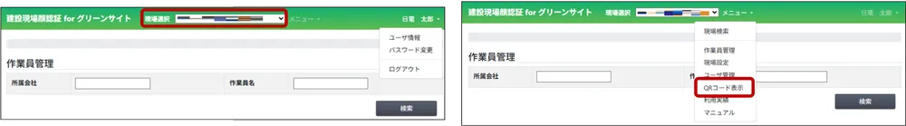 現場選択欄にて該当現場を選択し、「メニュー」の「QRコード表示」を選択します。