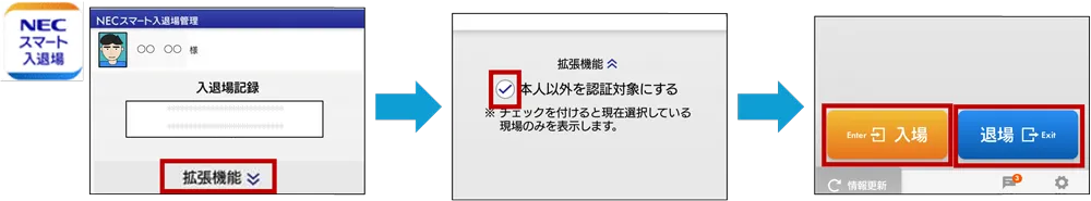現場名の下にある「拡張機能」をタップ→「本人以外を認証対象にする」にチェックを入れる→「入場」・「退場」ボタンを押し顔認証