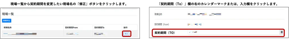 変更したい現場の「修正」ボタンを押し、「契約期間(To)」欄を変更してください。期間は月単位となります。