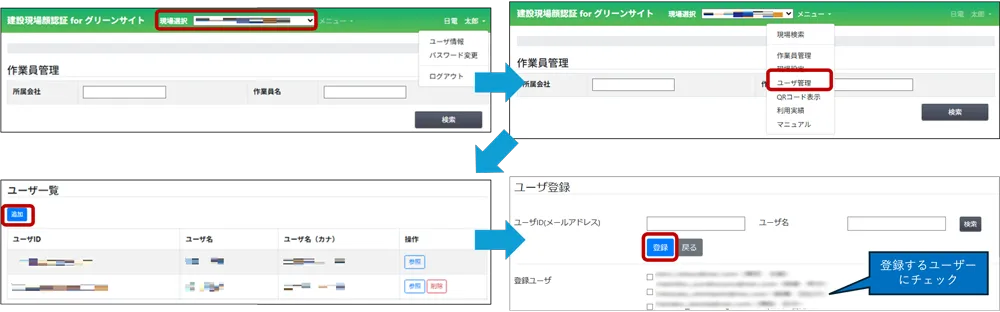 ※現場選択欄に現場が表示されない場合は、他の方が作成された現場のため、その現場を作成された方に操作をお願いしていただくか、「ユーザ管理」での追加を依頼してください。
