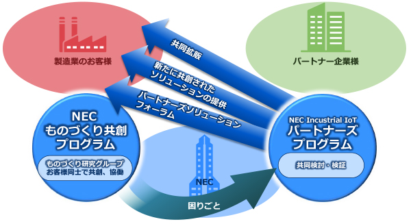 「共創パートナープログラム / Manufacturing」は、パートナー企業様とNECの共創を通じて製造業のDX実現に貢献すると共に、パートナー企業様、およびNEC双方の事業拡大を目指します。