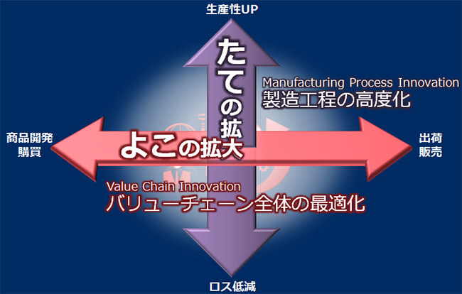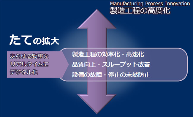 IoTの実践を、一製造現場における「タテ方向」(Manufacturing Process innovation:製造工程の高度化)と、製造業のバリューチェーンにおける「ヨコ方向」(Value Chain Innovation:バリューチェーン全体の最適化)に拡大していくことによって、製造プロセス全体の無駄を解消し、効率化、高速化、バリューチェーンの最適化、品質向上などを実現していくこと。それが、次世代型ものづくりが目指す一つの方向であると私たちは考えています。